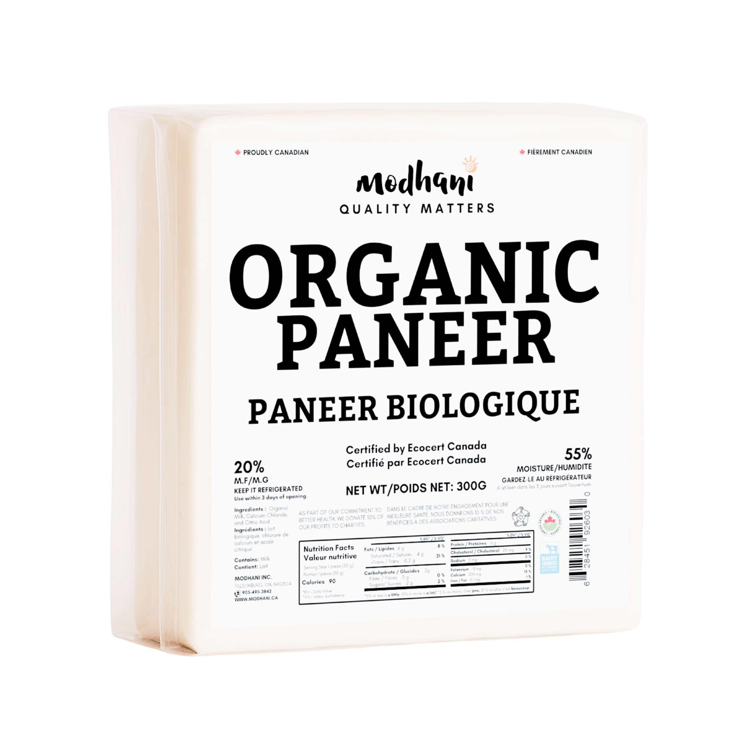 Modhani Organic Paneer 300gms — soft, fresh, and protein-rich. Made from pure Canadian organic milk, perfect for healthy and tasty home cooking.